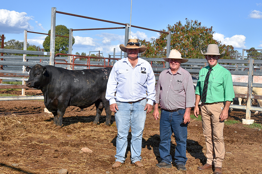 Justin Dickens, JAD Angus Stud, with Chas Nobbs, Nobbs Grazing, Moura, who purchased the top-priced Angus bull (Lot 3: JADA Unanimous U616) for $22,000 at the 2nd Annual JAD QLD Bull Sale at Rolleston on August 22, 2025. They are pictured with Nutrien Stud Stock Auctioneer, Dane Pearce.